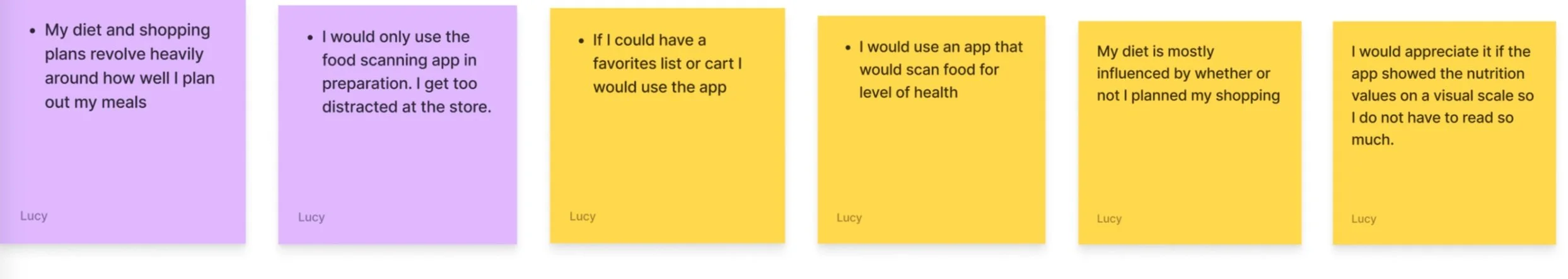 During my research for Nutriscan, I interviewed three individuals: Slater Ward, a college athlete with unstructured shopping habits; Brianna Heckert-Smith, a college student who uses scanning apps for cosmetics and desires one for groceries; and Julie Law, a mom with dietary restrictions and structured eating habits. These interviews highlighted a common need for notifications, a grocery list feature, personalization, and budgeting. Their insights helped shape the app's development by pinpointing desired features and systems. Below are sticky notes with quotes from the interviews.
